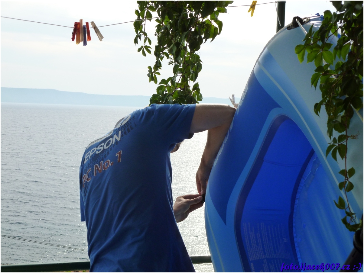 pohled na balkon s nafukovacím člunem