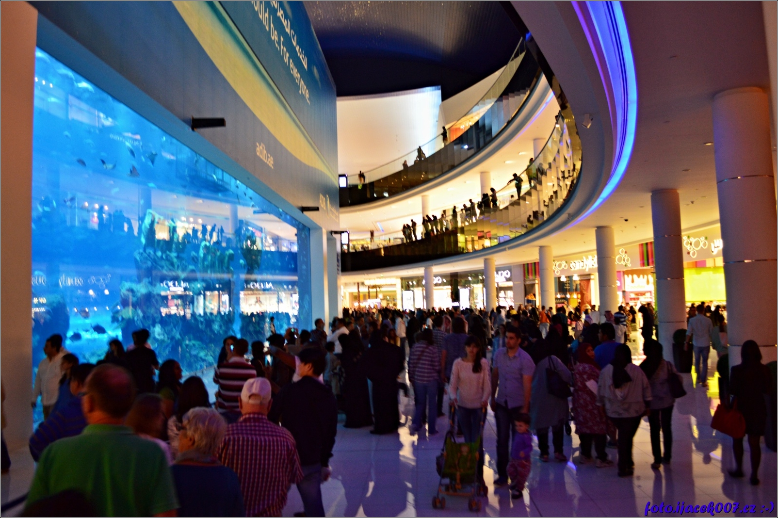Pohled na obrovské akvárium které je součástí obchodního centra,