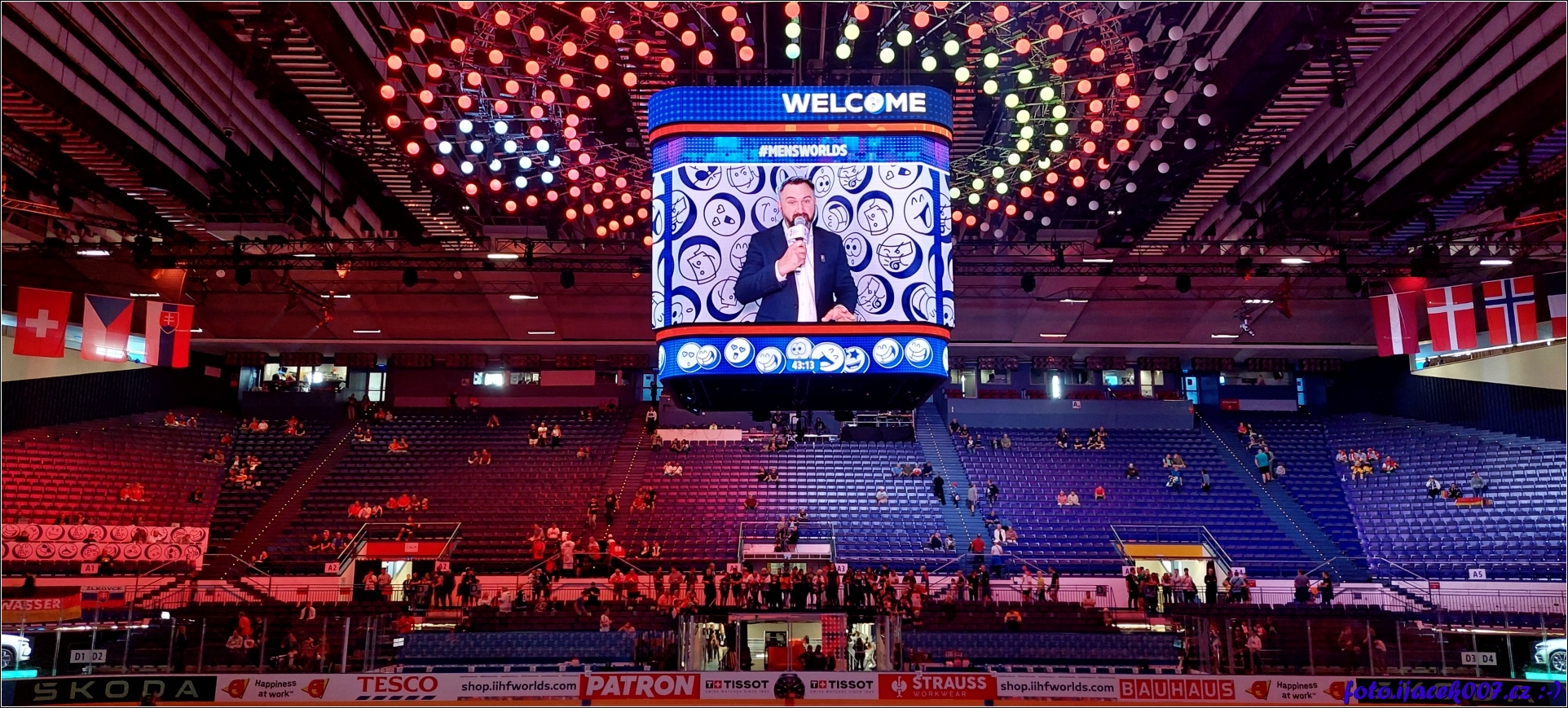 Pohled do útrob Ostravar arény a její multimediální kostku nad ledem.