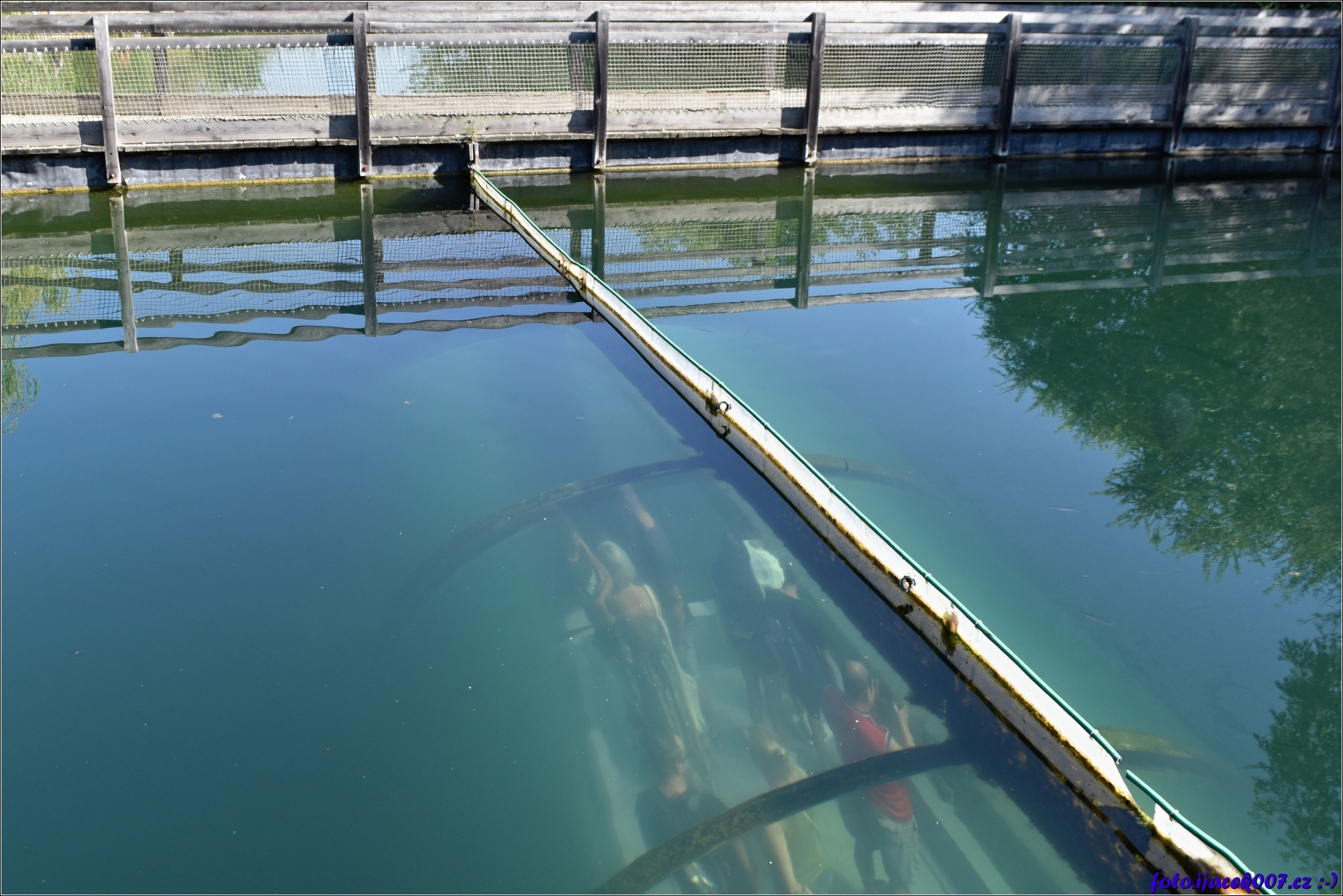 Pohled na skleněný tunel pod hladiinou vody.