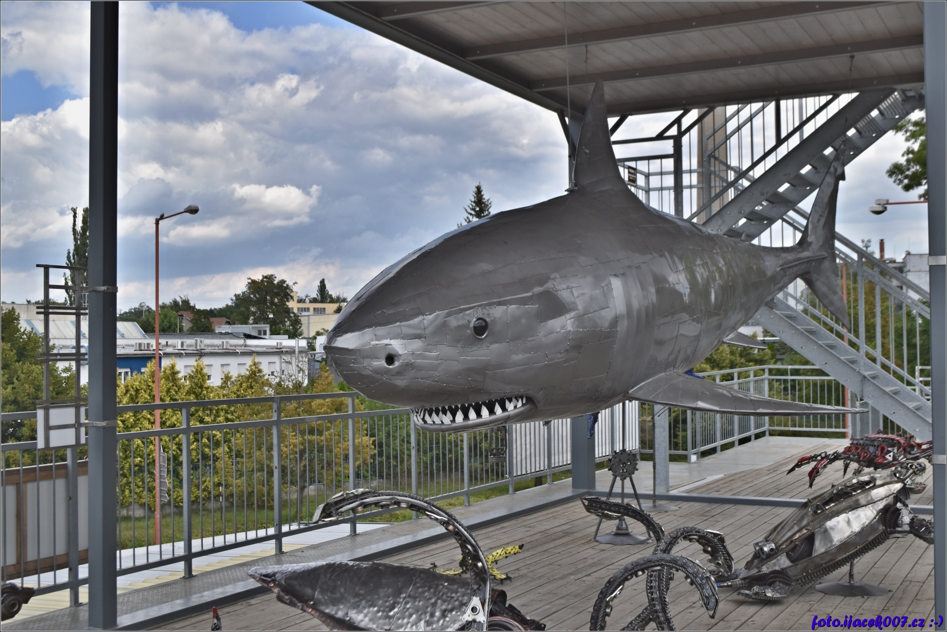 Žralok dominující prostoru nad porodnicí na vyhlídkovém ochozu na střeše.