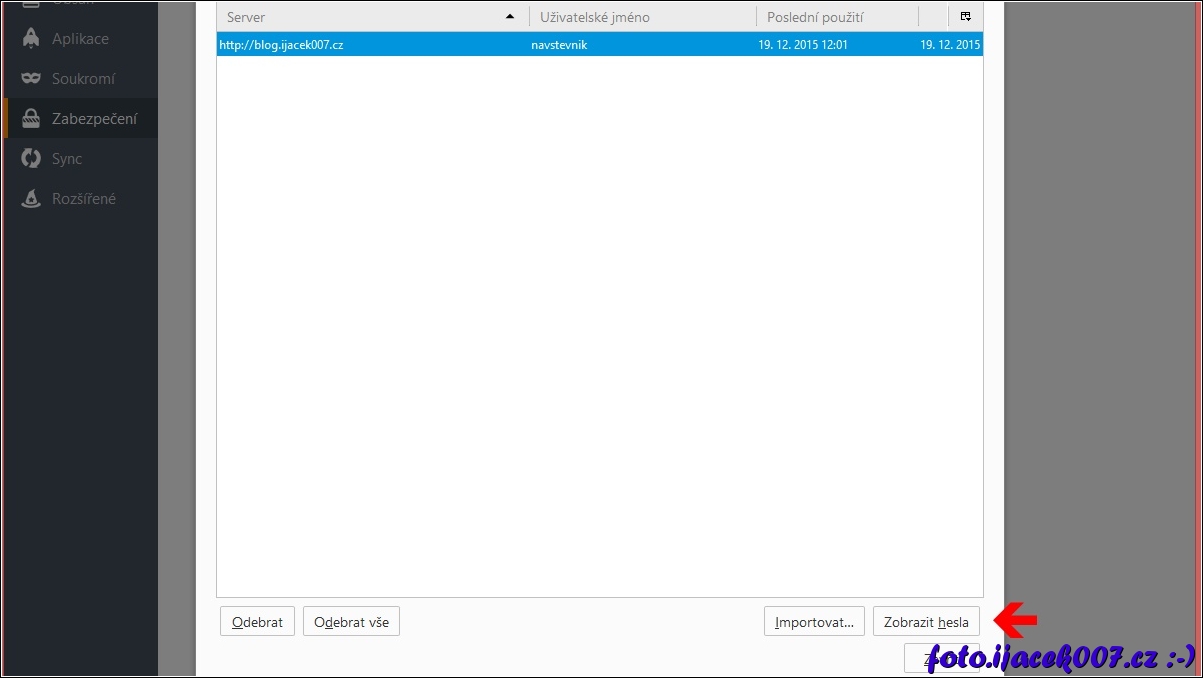 pohled na tabulku uložených hesel webových stránek
