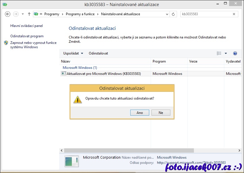 Potvrzení odinstalace aktualizace
