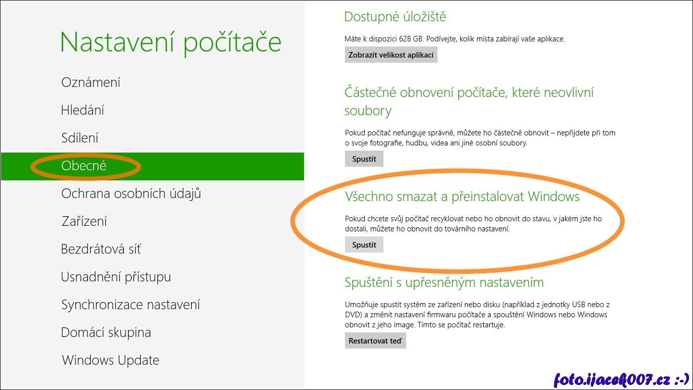 Položka nastavení obecné a všechno smazat systému Windows 8