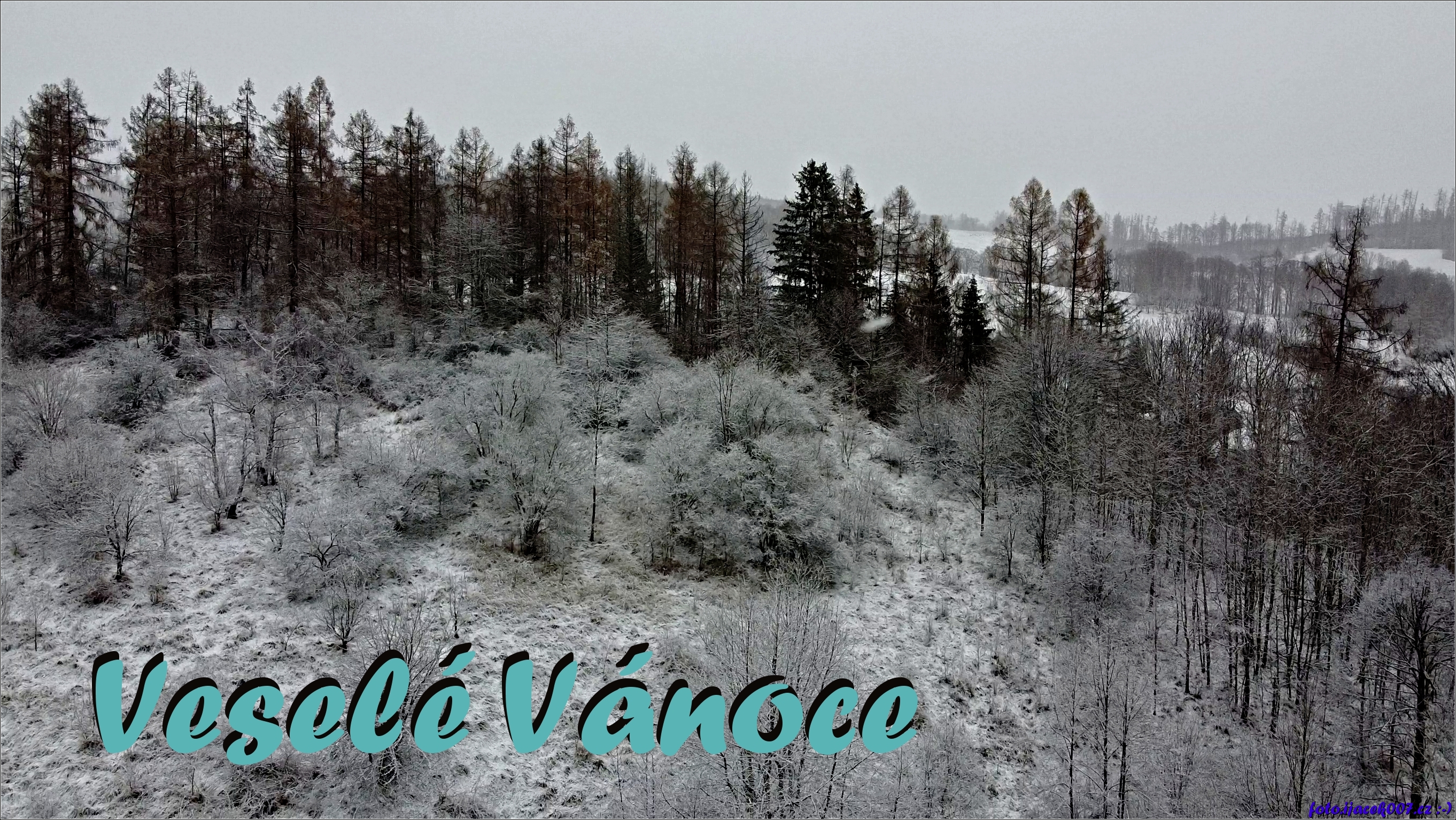 Fotografie zasněžené přírody jako přání k Vánocům.