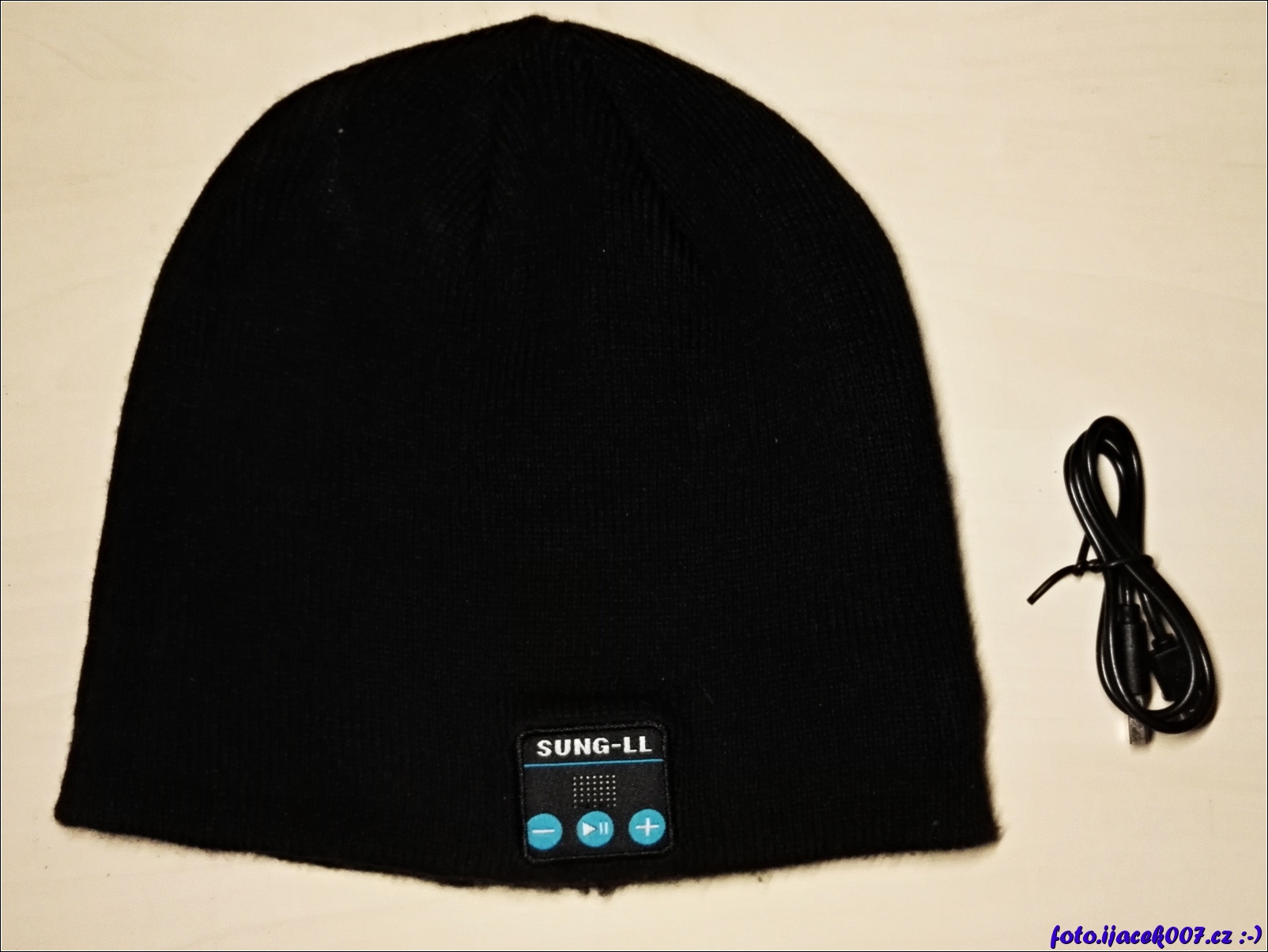 čepice s čínského eshopu určena na poslech hudby z mobilního telefonu