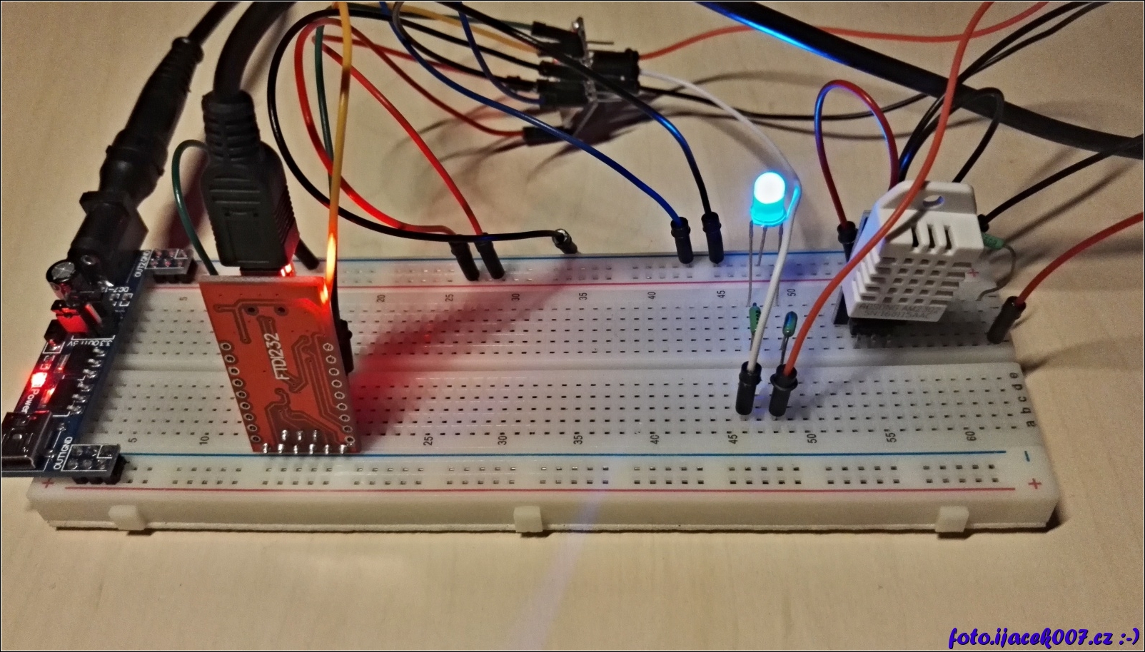 reálné zapojení modulu s teploměrem a dvoubarevnou diodou signalizující stav připojení k bezdrátové síti.