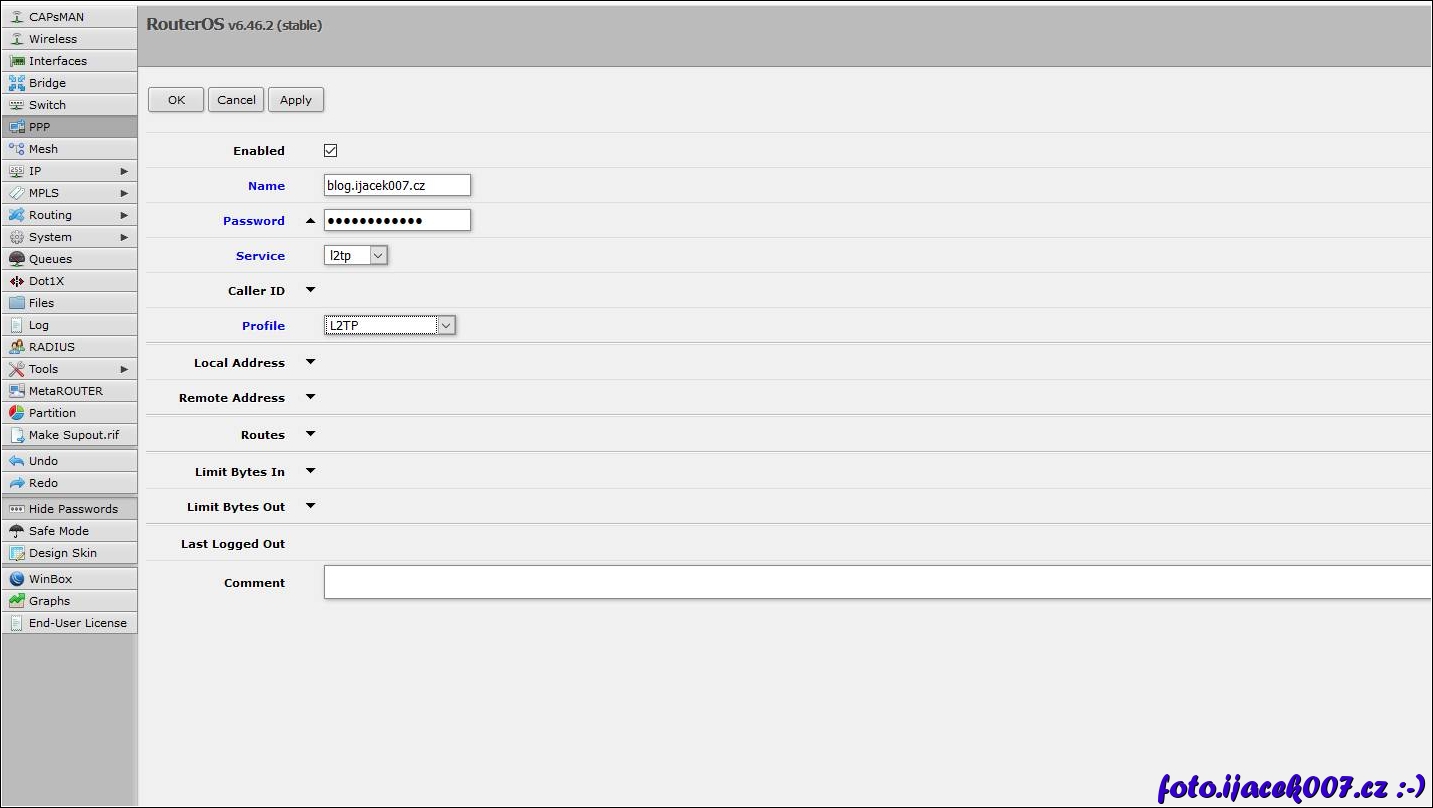 zadání uživatele hesla a přístupu k L2TP