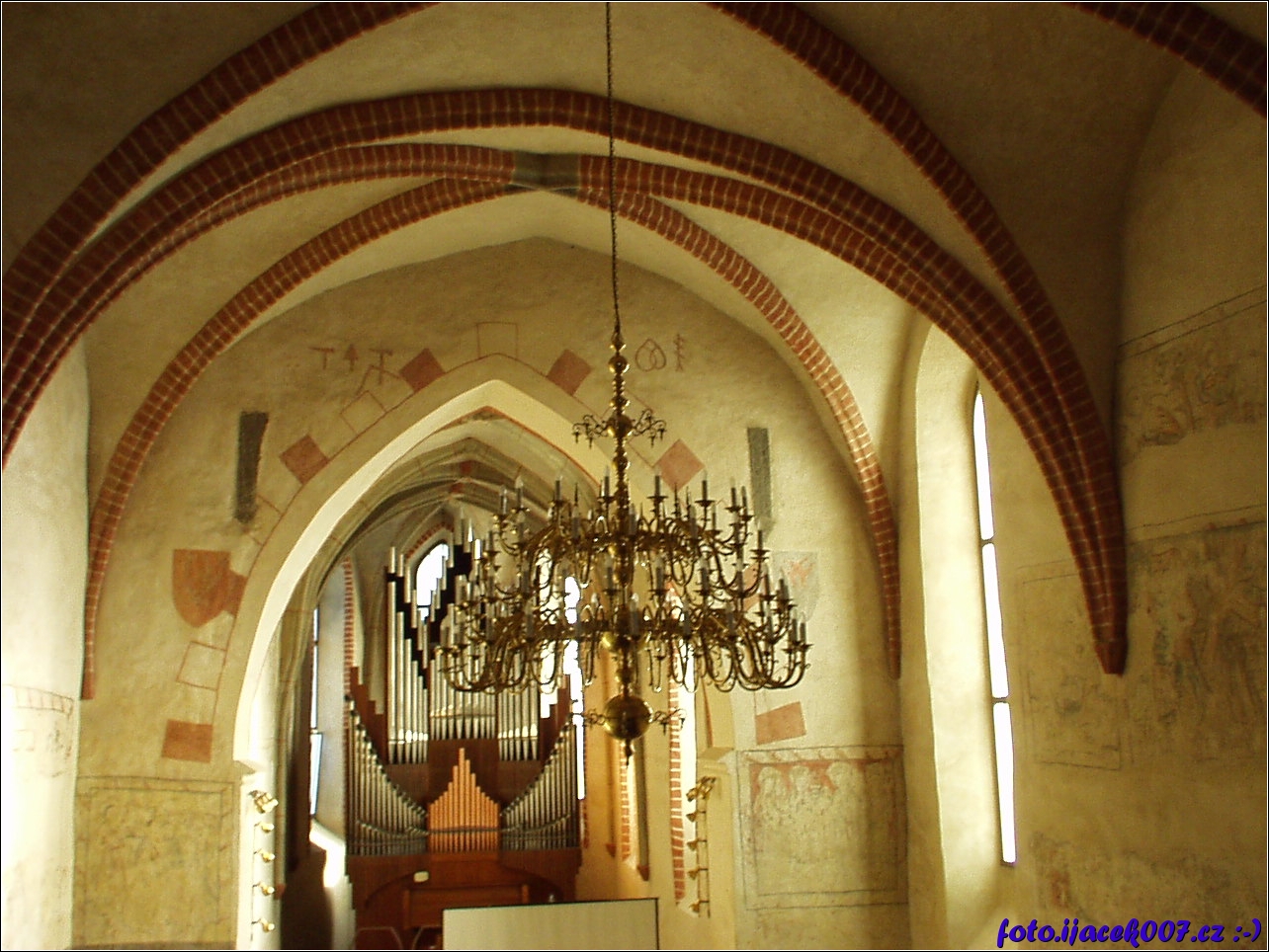 pohled na klenuté stropy lustr a v dáli varhany Krnovské koncertní síně