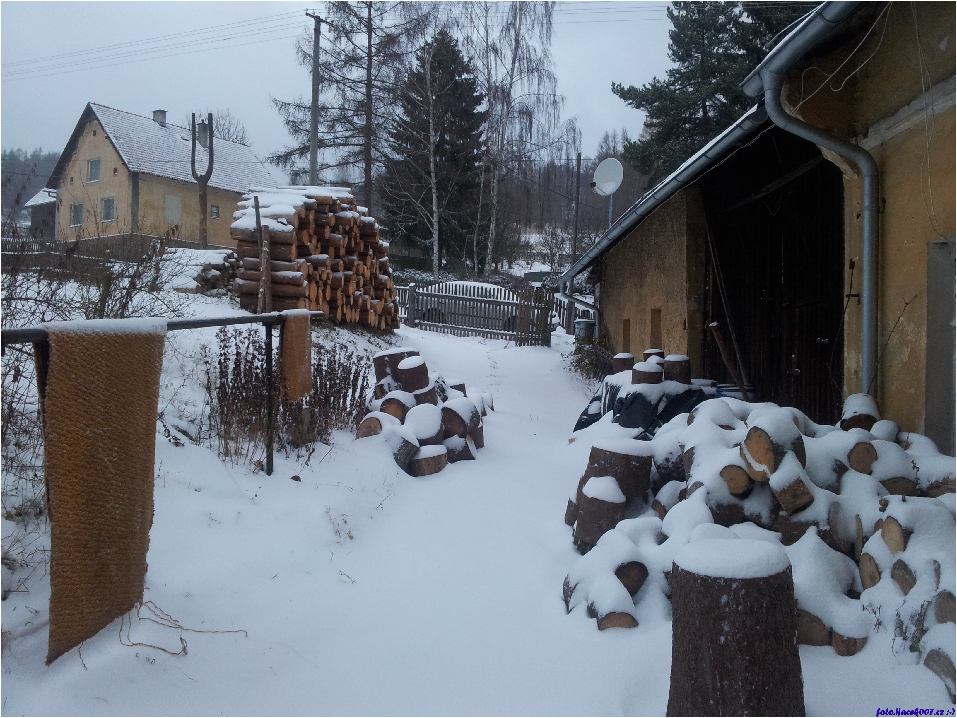 pohled na zasněženou hromadu dřeva na dvoře