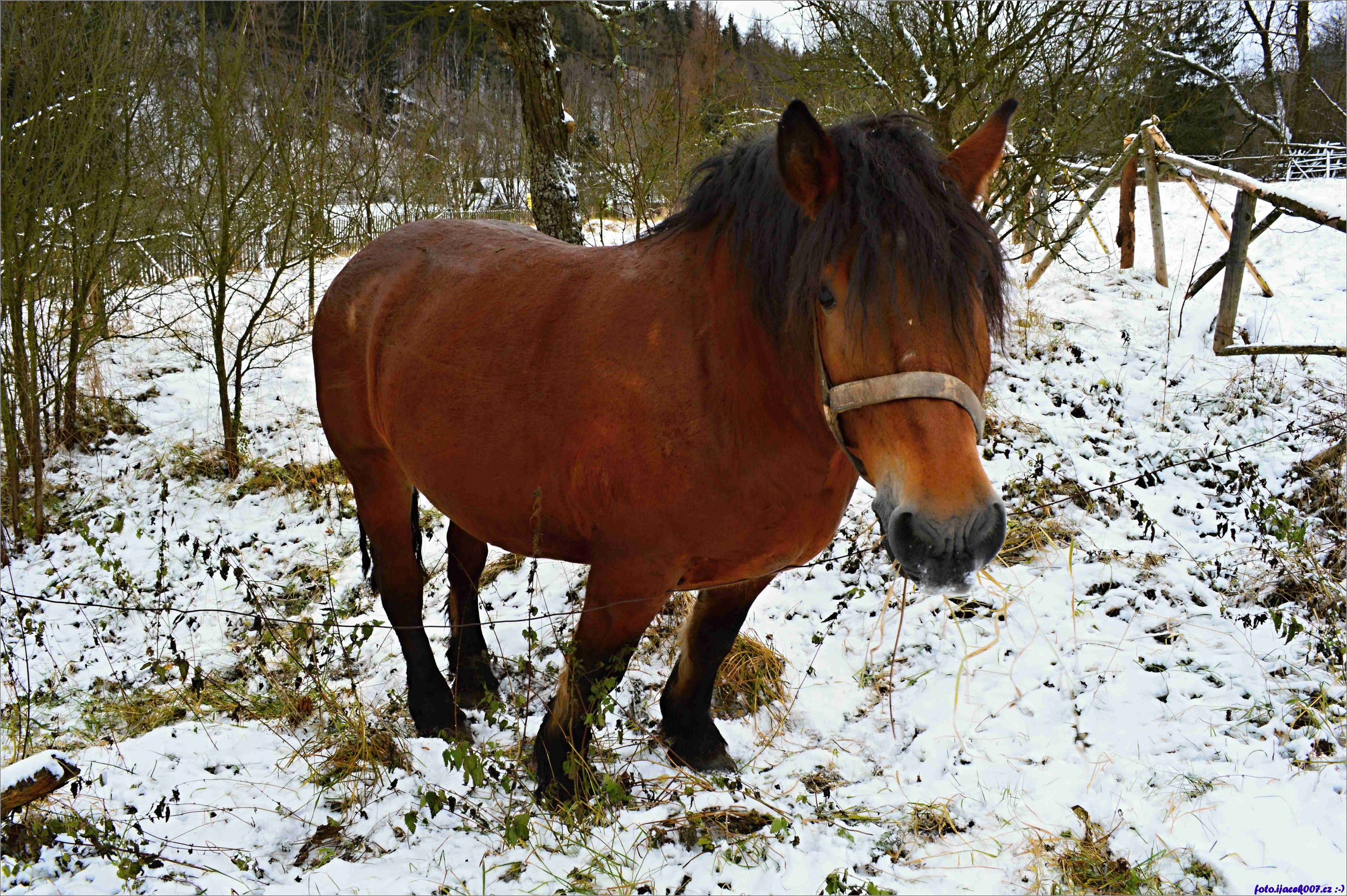 pohled na tažného koně v zasněžené ohradě.