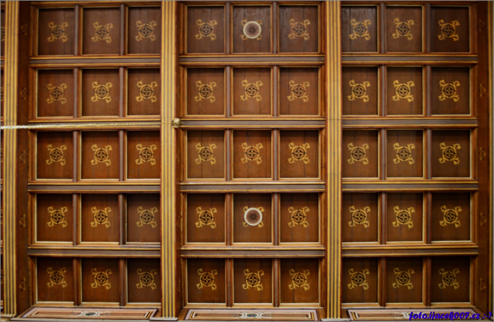 pohled na krásný dřevěný kazetový strop synagogy