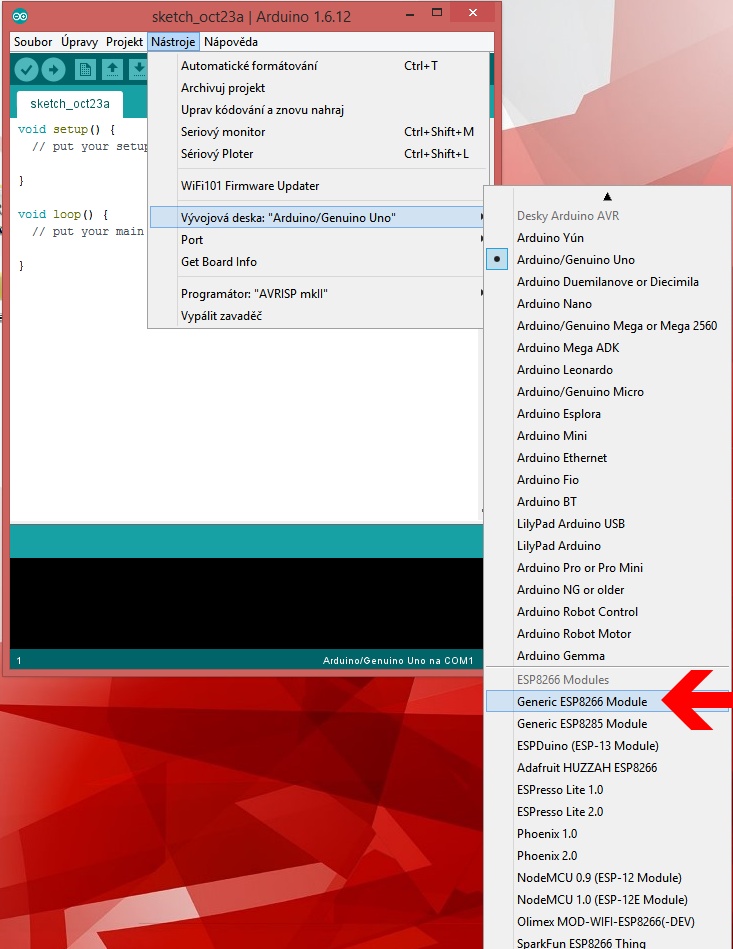 přepnutí rozhraní Arduino pro desku ESP8266
