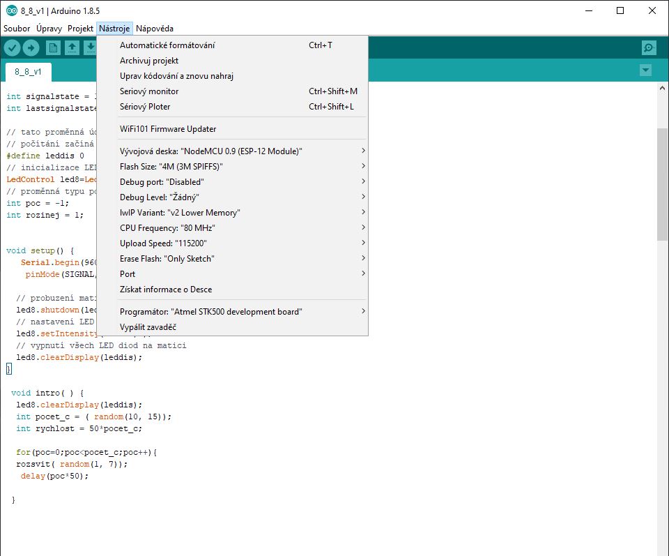 Obraz nastavení programovacího Arduino rozhraní.