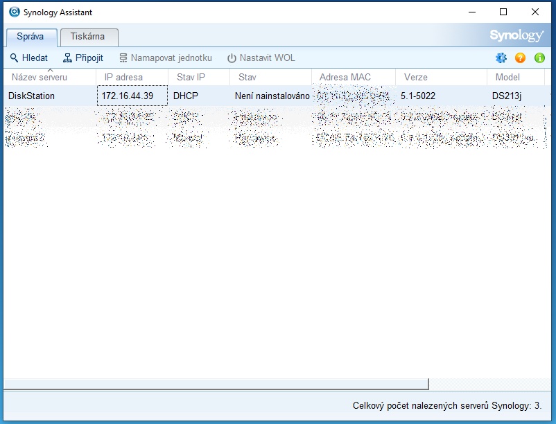 obrazovka aplikace synology asistant a zobrazení nalezených synology v síti