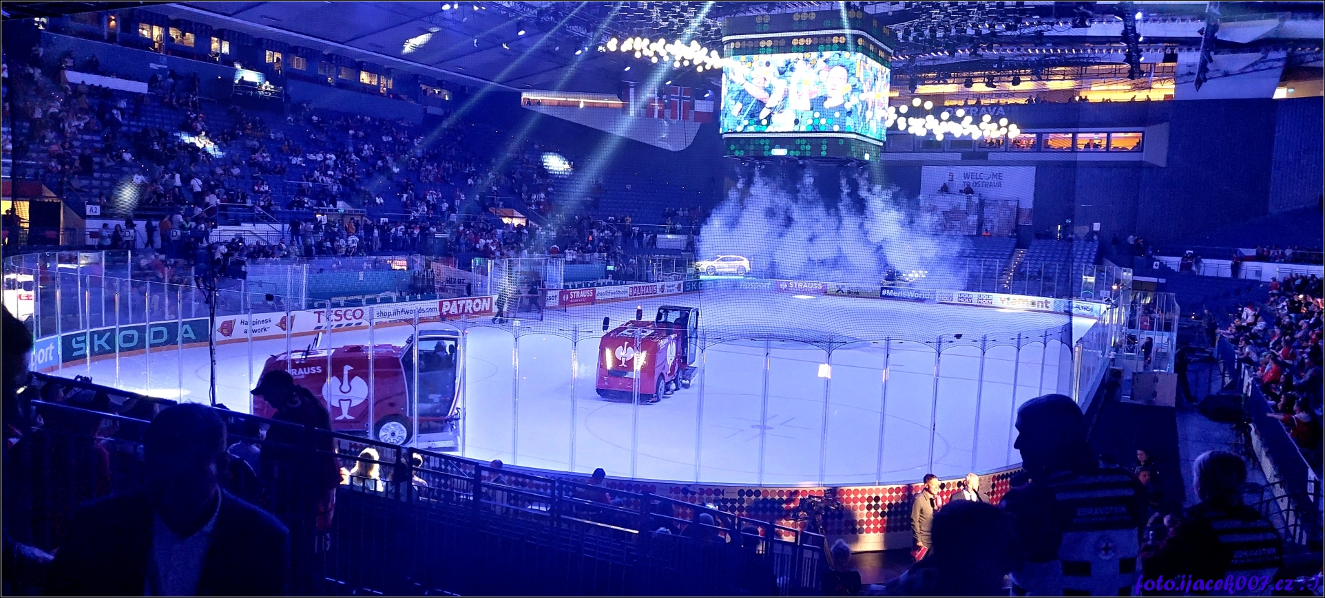 Pohled na upravu ledové plochy před zápasem či mezi třetinami.