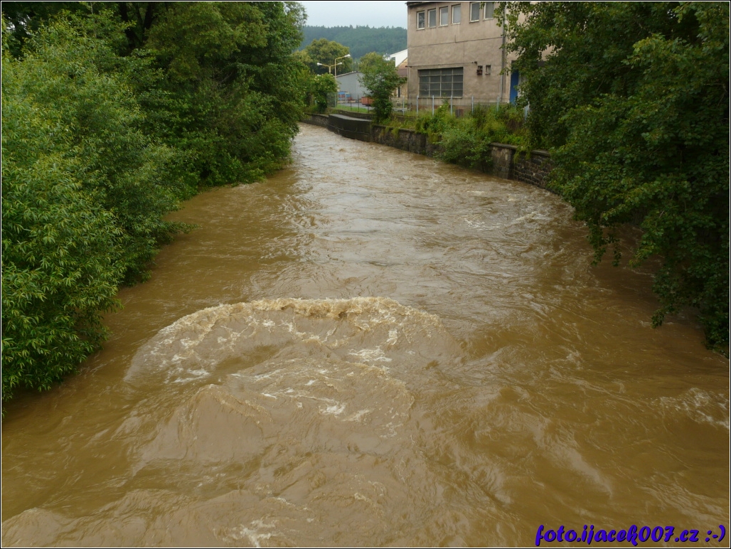 Pohled proti proudu řeky kousek od hlavního krnovského nadraží.