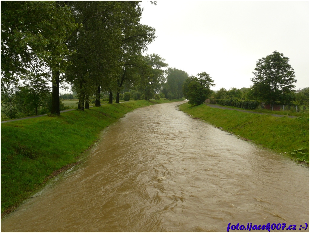Pohled s proudem řeky Opavice směrem k soutoku.