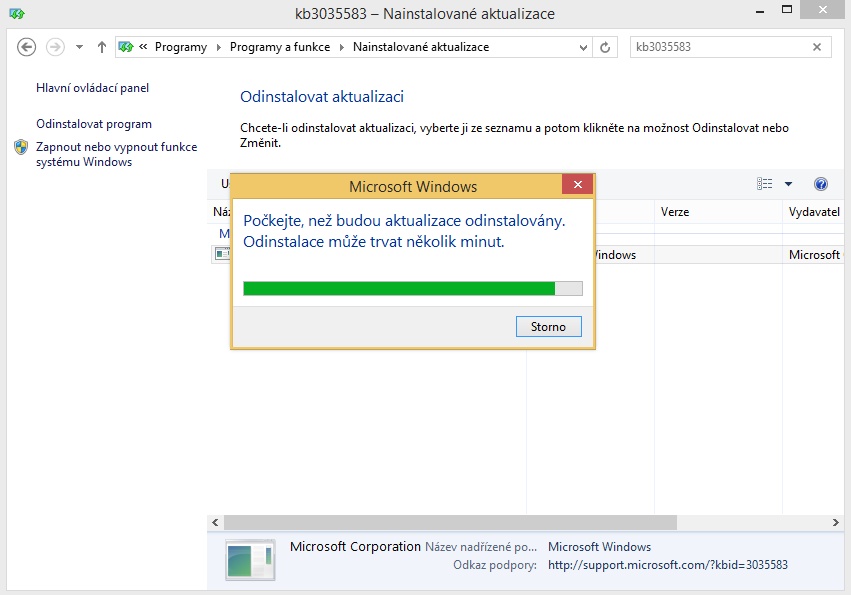 průběh odinstalace aktualizace