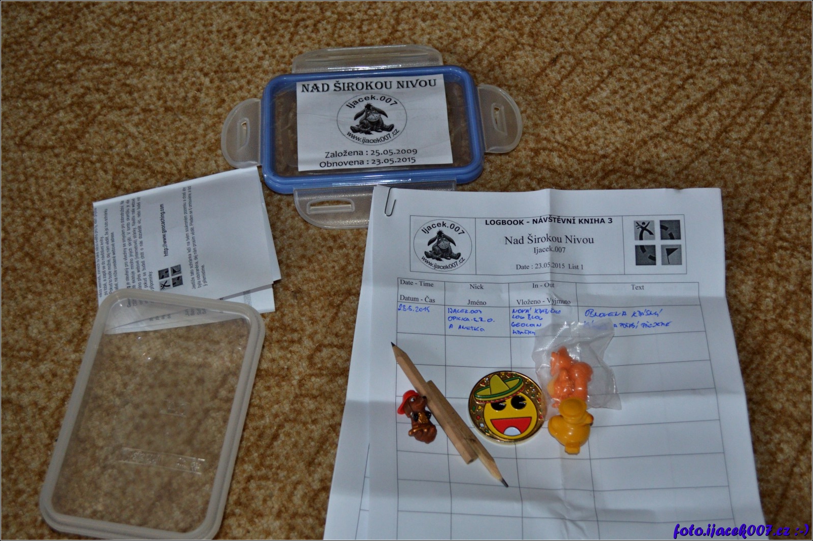 obsah nové krabičky pro hru Geocaching