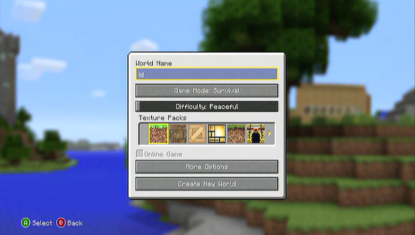 pohled na vytvoření nového světa minecraft na konzoli xbox360