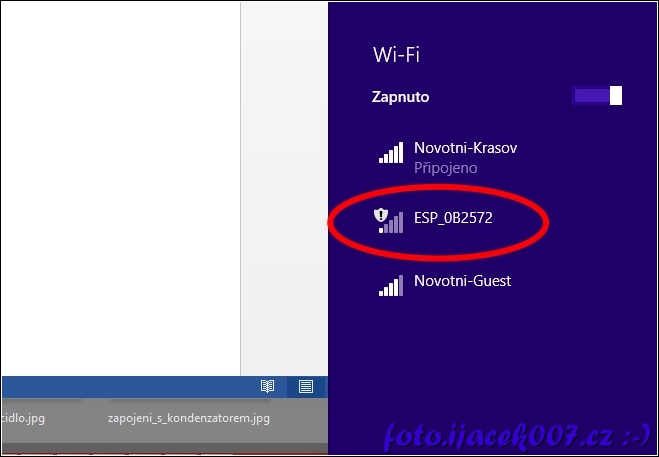 pohled na bezdrátové sítě v okolí a hlásící se ESP modul jak Acess Point