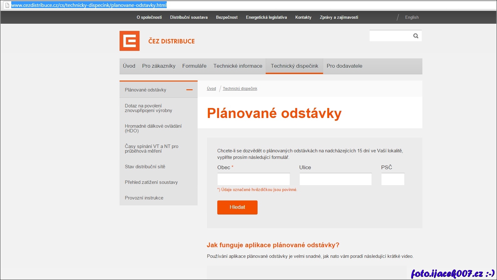 Formulář pro vyhledání plánovaných odstávek elektrické energie.