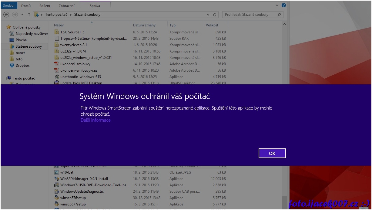 dialog Window 8 o blokaci spustitelného skrytu.